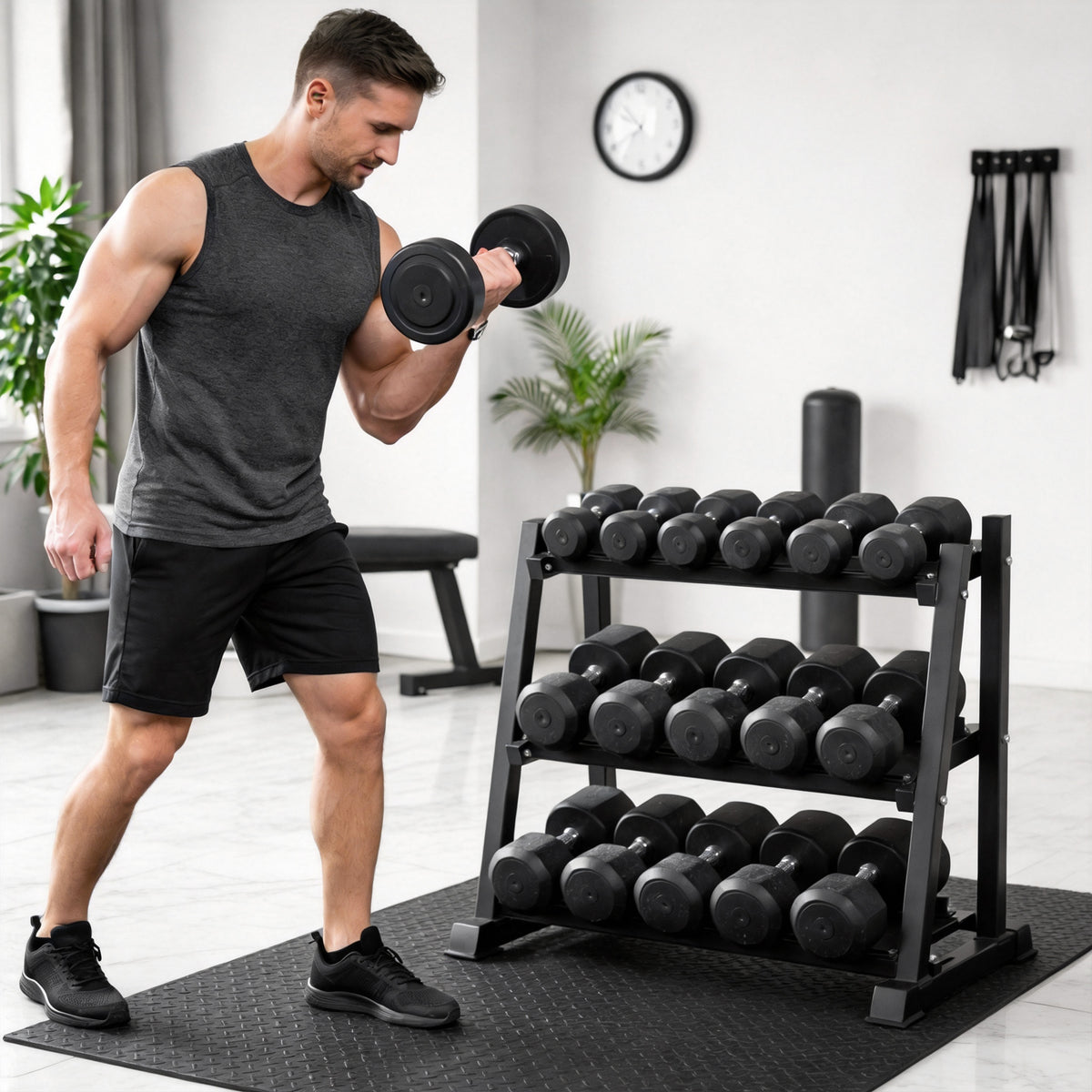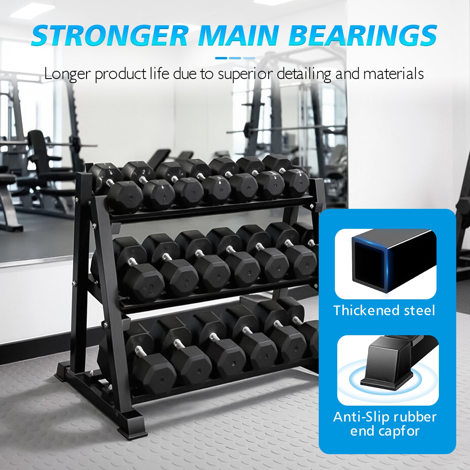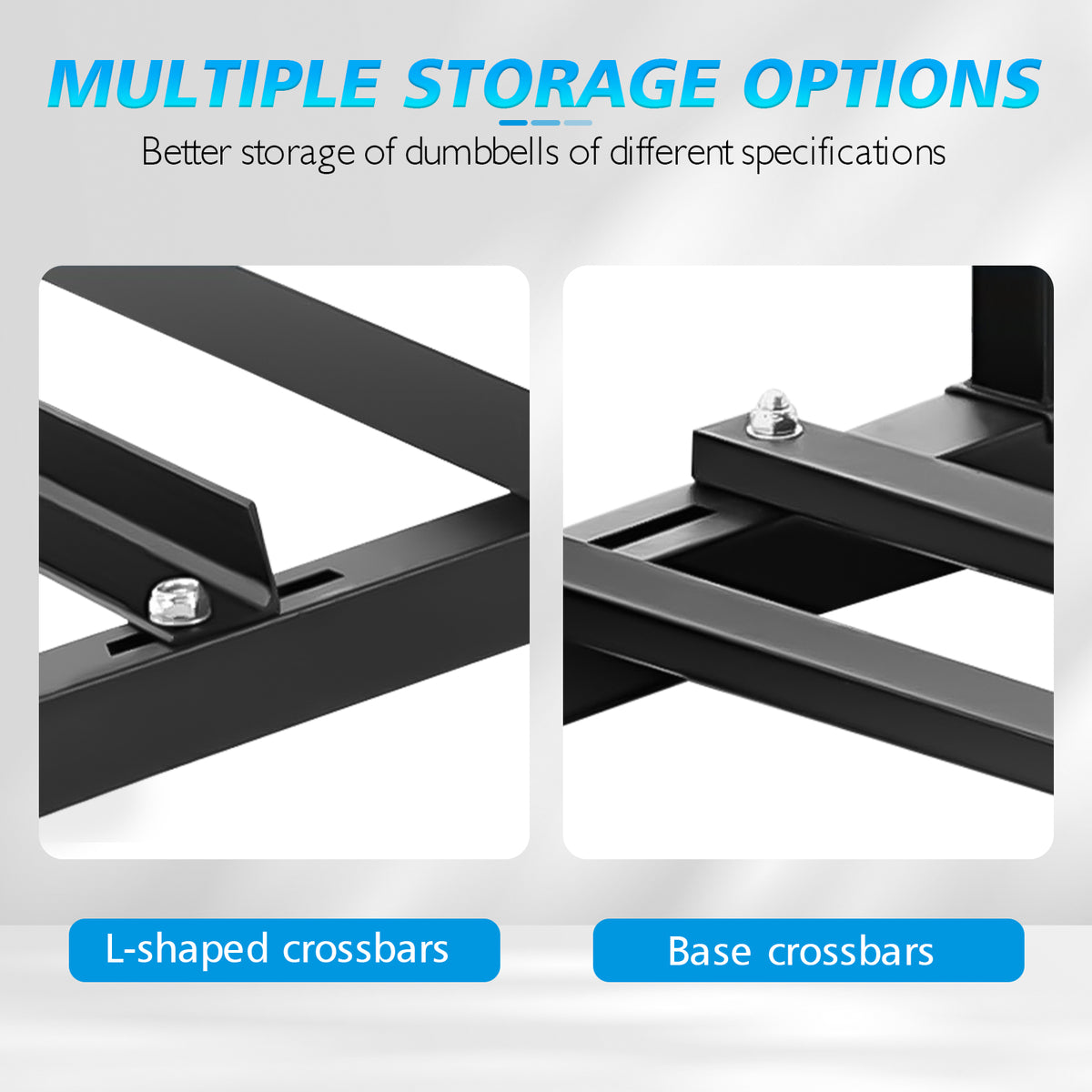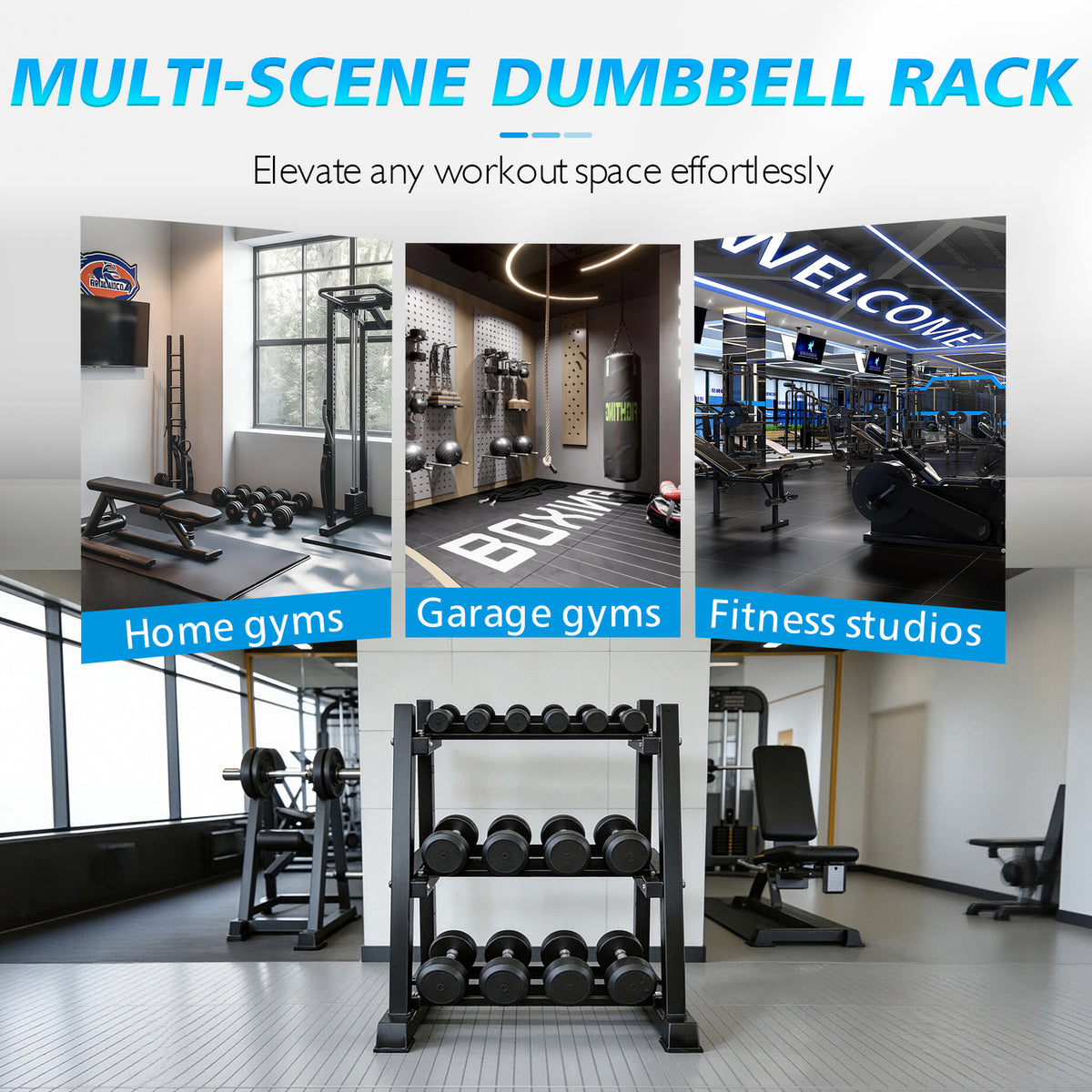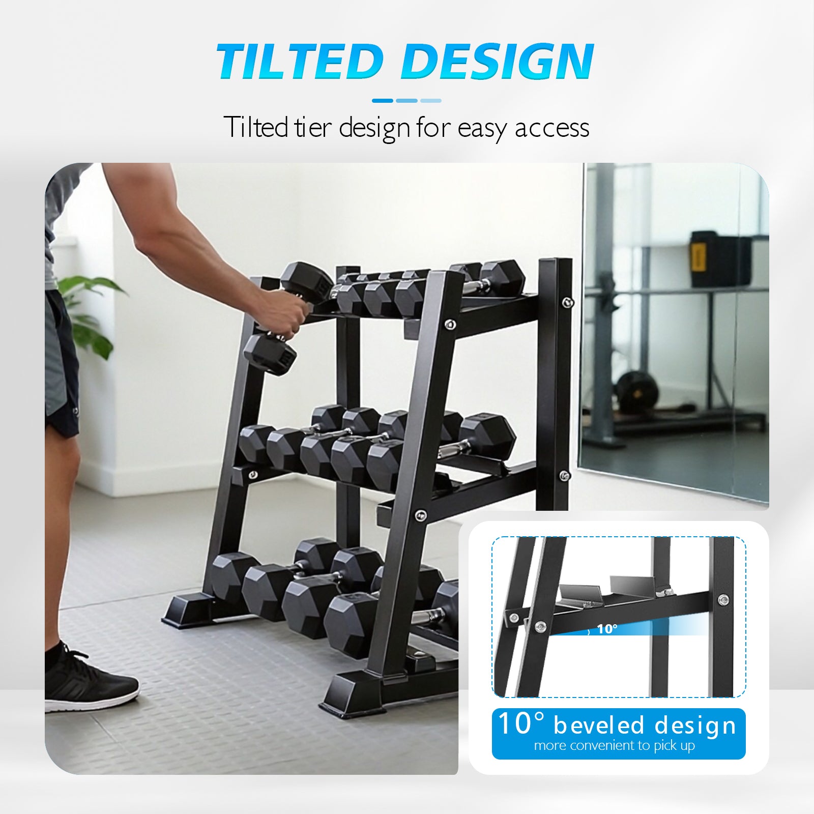 - 【Smart Multi-Equipment Storage】 Features a 3-tier dumbbell system + 4 barbell bars with dedicated zones for kettlebells, plates, and specialty bars. Organize all your strength equipment in one centralized hub.