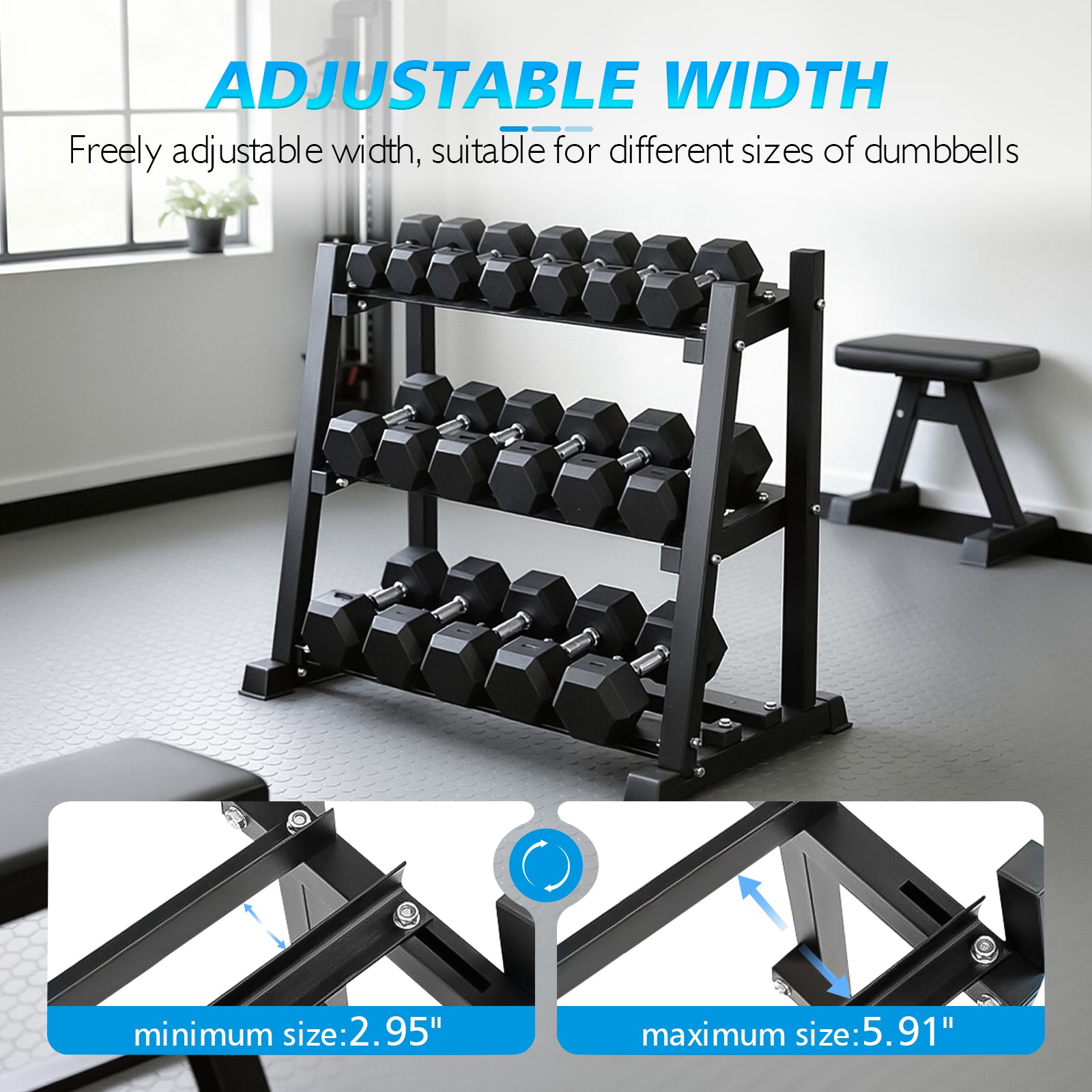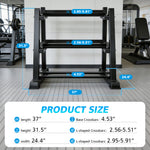 - 【Space-Optimized & Adjustable】 37"L x 30.5"W x 32"H (42 lbs) footprint fits tight spaces. Adjustable shelf widths accommodate any dumbbell size. Tool-free assembly and lean storage-ready design.
