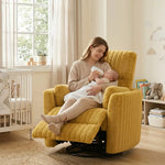 My husband and I picked this chair for our nursery, and it didn’t disappoint. The seat is really spacious—about 32″ wide with a high back—so there’s plenty of room while nursing, and it never feels cramped. The backrest reclines and the footrest rises at the same time, giving full-body support. The built-in USB ports are super handy for charging my phone or baby devices. Highly recommended for new parents!