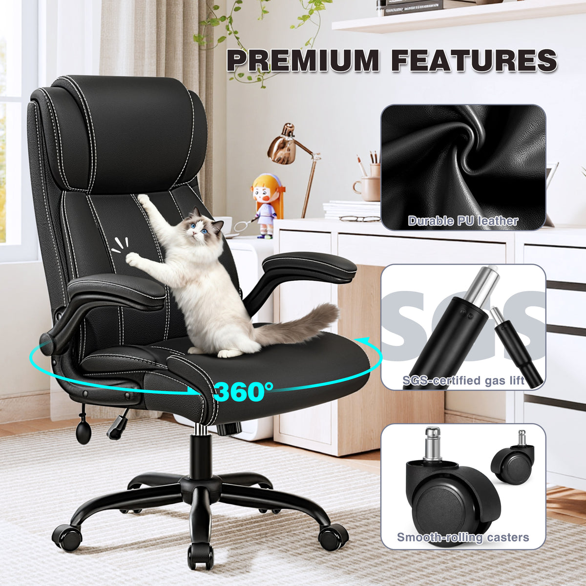 - [Premium Bonded Leather with 360° Swivel]: Wrapped in durable bonded leather that resists peeling and scratches, this executive chair adds a sleek look to any office. Enjoy smooth 360° rotation for effortless movement and positioning.
