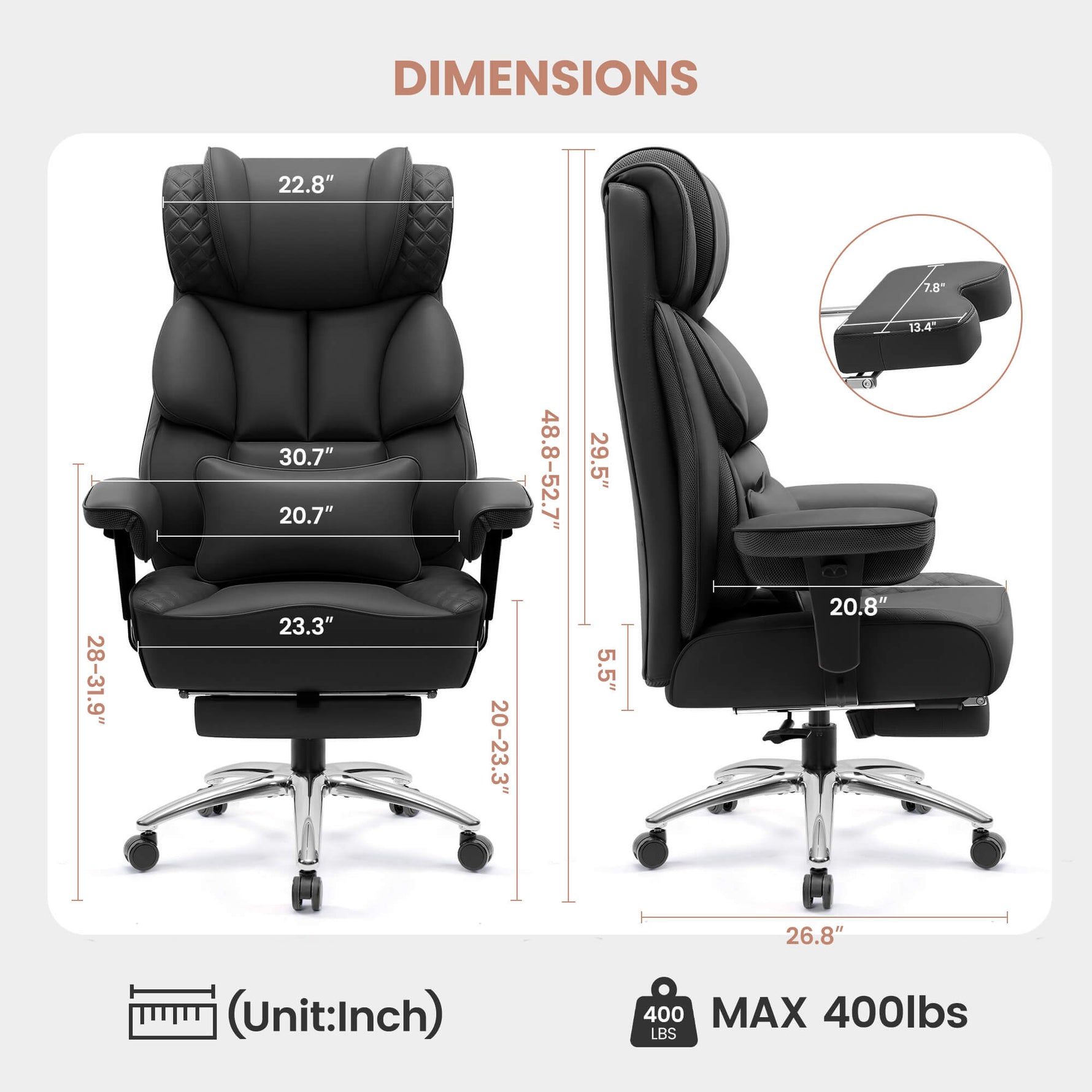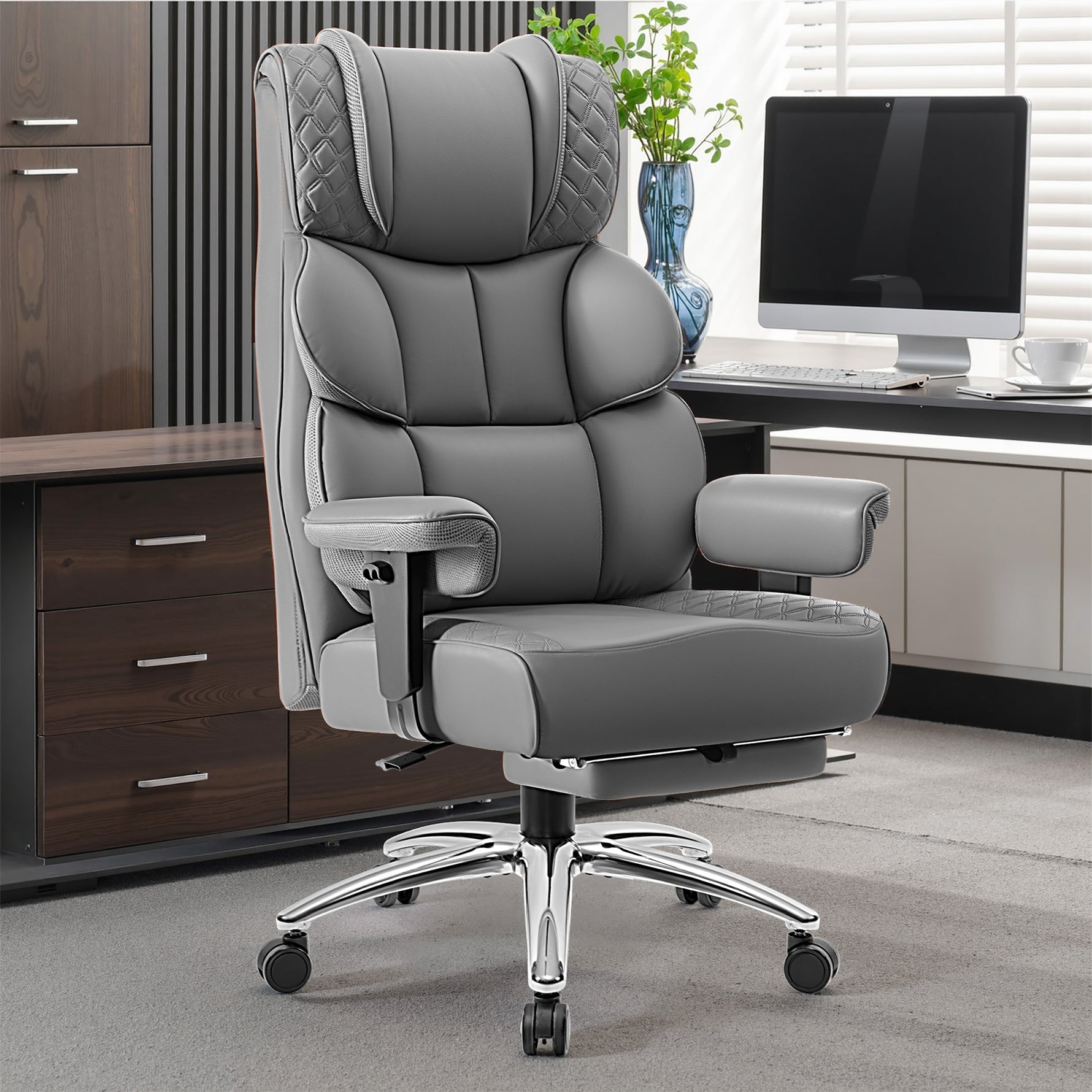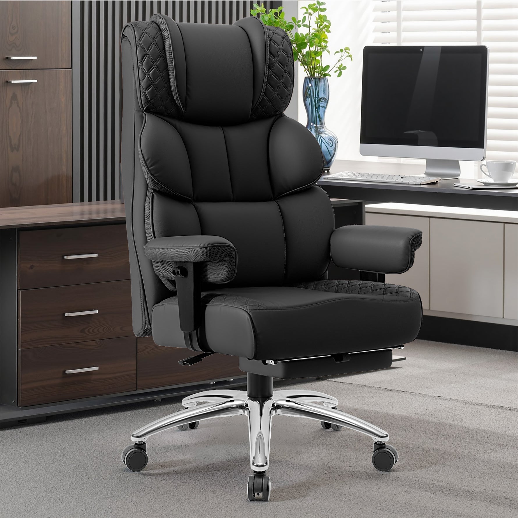 This chair is big, comfy, and feels sturdy. The leather is soft, and the high back gives great support for my back and neck. I really like the footrest—it's nice for taking a quick break—and it reclines smoothly. It's very comfortable for long hours at the desk or working from home.