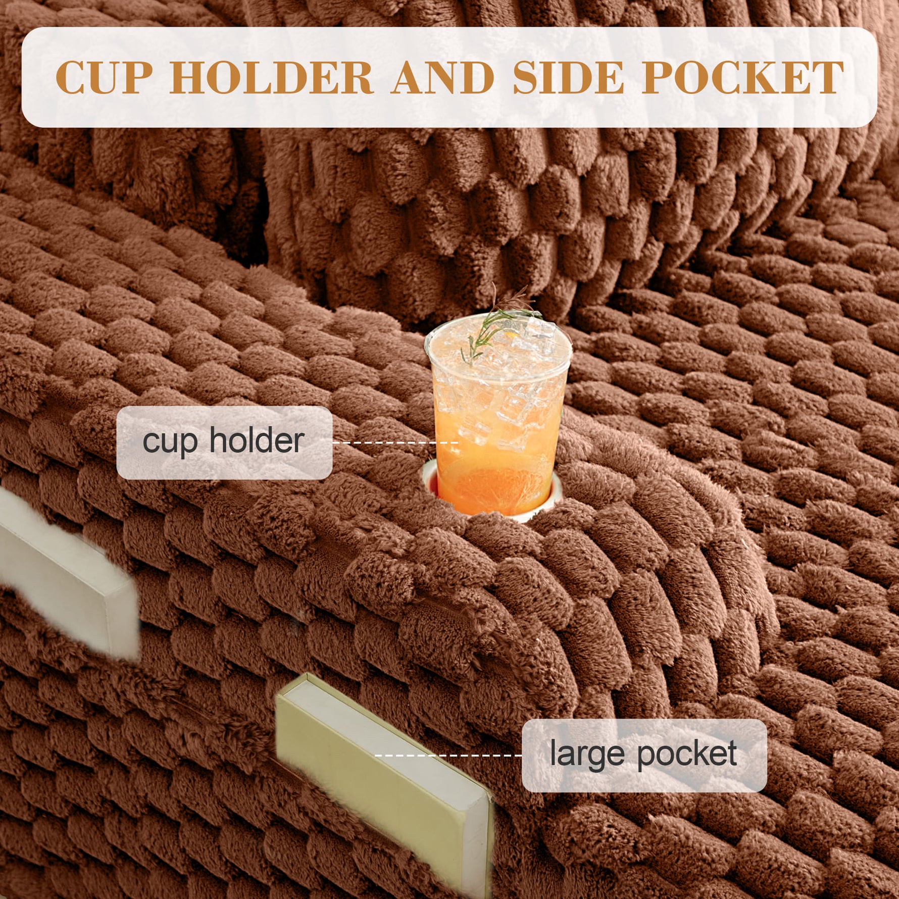 This sofa adds cup holders and side pockets to the comfortable fur-upholstered sofa bed.