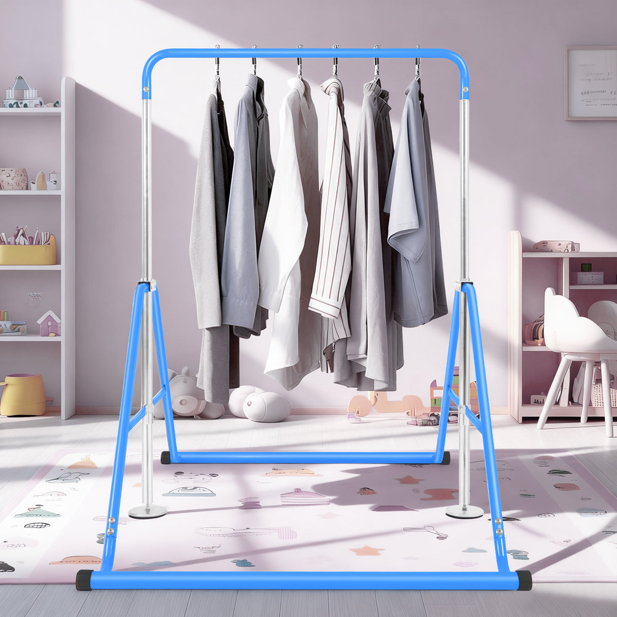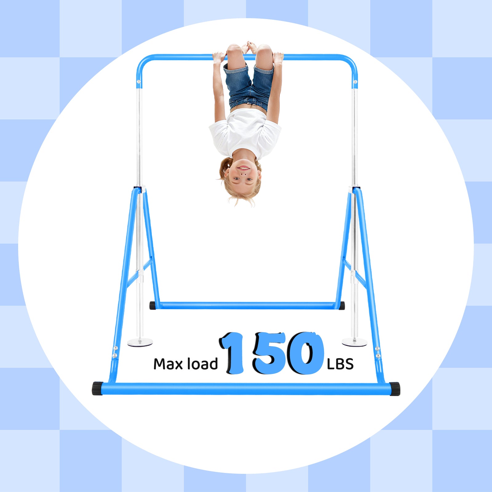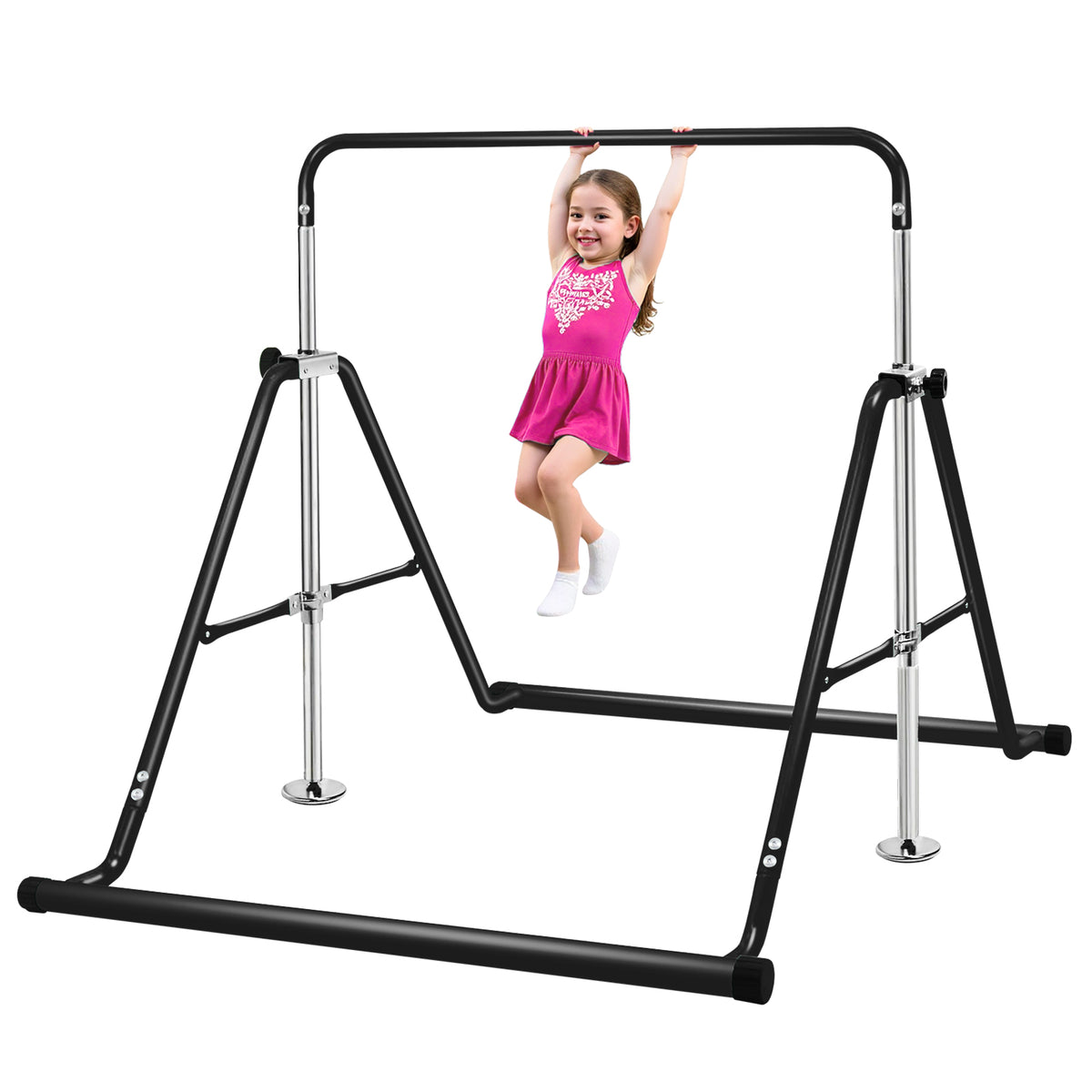【 STURDY & SAFE DESIGN】 The Primy gymnastics bar features a triangular base structure for superior stability, crafted from heavy-duty steel to ensure safety and durability for kids. Its smooth powder-coated surface prevents scratches, while the 150lb weight capacity makes it perfect for children aged 4-10 years.