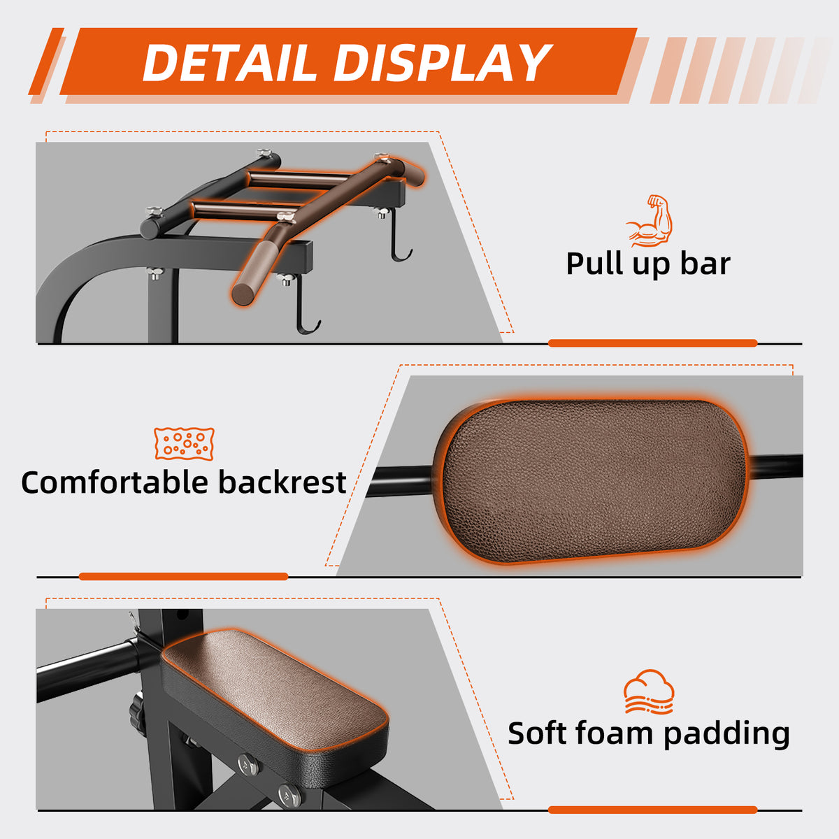 👍【Ergonomic & Comfortable Support】Equipped with a stable backrest and cushioned elbow pads, this workout station reduces joint strain and minimizes the risk of injury, allowing for longer, more comfortable training sessions.