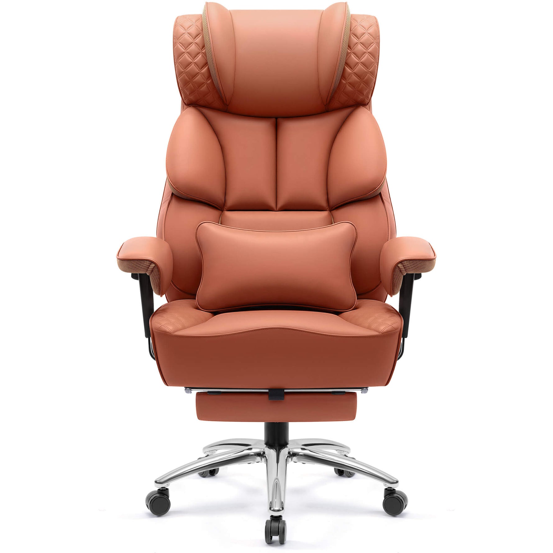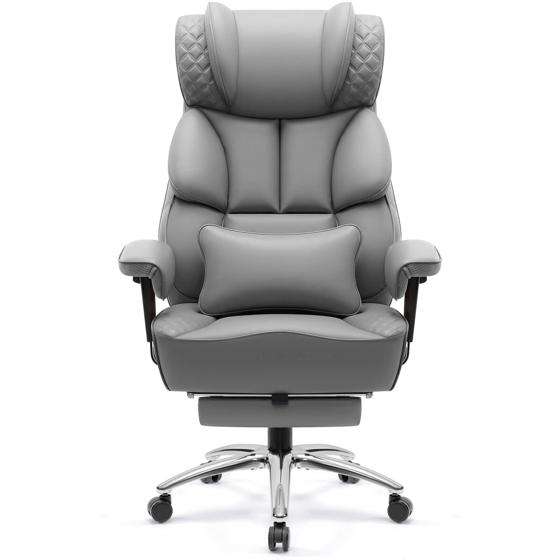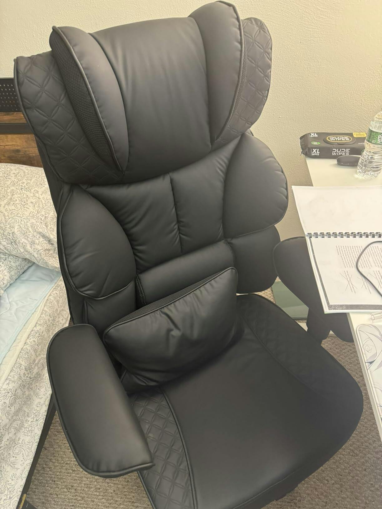 I really love this chair. It’s very comfortable and has a wide seat. The added cushion provides perfect lumbar support for those long working days. The back is padded and relaxing, letting you sink in relieving stress. I like the footrest for added relaxation during breaks. It’s easy to maneuver and roll around. The quality is outstanding and assembly was quick and easy. The black leather is soft and gives it a sturdy feel. The quality exceeds my expectations. I highly recommend this chair for the excellent price.